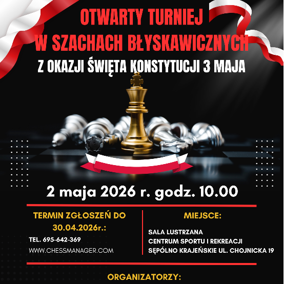 Gmina Sępólno Krajeńskie, MLKS Krajna Sępólno Krajeńskie oraz Centrum Sportu i Rekreacji w Sępólnie Krajeńskim zapraszają na Otwarty Turniej w Szachach Błyskawicznych z Okazji Święta Konstytucji 3 maja, który odbędzie się 2 maja 2026r. o godzinie 10.00 w Sali Lustrzanej Centrum Sportu i Rekreacji (wejście od strony kortów tenisowych – wjazd od stacji BP) ul. Chojnicka 19. Czytaj dalej