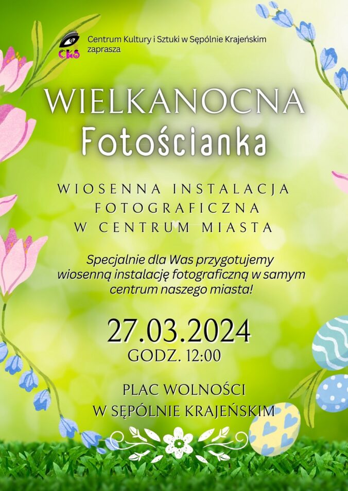 W środę 27 marca w samym centrum miasta będzie czekała na Państwa instalacja fotograficzna. Chcemy zachęcić Państwa do zrobienia sobie fotografii w wiosennej scenerii. Specjalnie dla Was przygotujemy wielkanocną dekorację, będącą świetnym tłem do zdjęć, co może okazać się ciekawą propozycją do zrobienia sobie na jej tle zdjęcia. Będziemy czekać na Państwa 27 marca o godz. 12:00 na Placu Wolności w Sępólnie Krajeńskim.