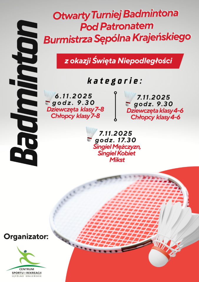 Centrum Sportu i Rekreacji zaprasza do udziału w Otwartym Turnieju Badmintona Pod Patronatem Burmistrza Sępólna Krajeńskiego z Okazji Święta Niepodległości. Zmagania odbędą się w dwóch dniach (czwartek i piątek), 6 – 7 listopada 2025r. Czytaj dalej