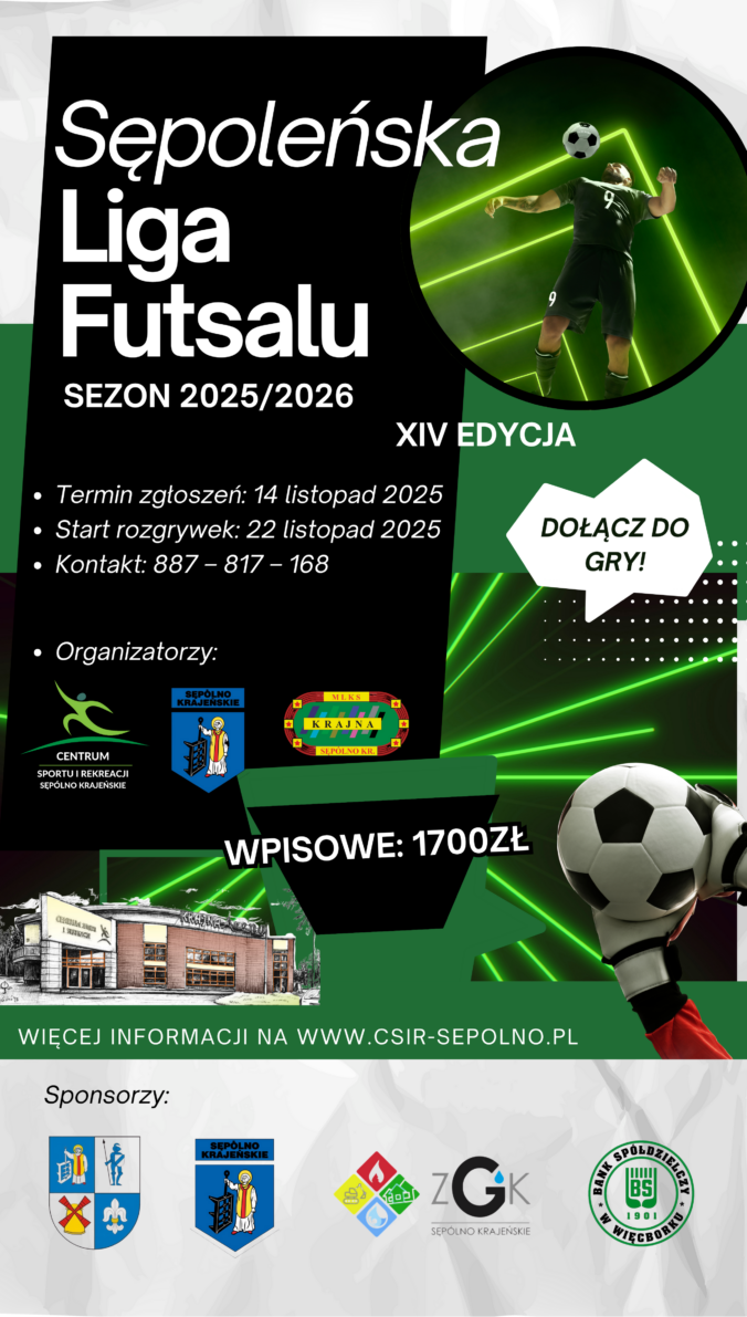 Gmina Sępólno Krajeńskie, Centrum Sportu i Rekreacji w Sępólnie Krajeńskim oraz MLKS Krajna Sępólno Krajeńskie zapraszają do udziału w XIV edycji Sępoleńskiej Ligi Futsalu. Czytaj dalej