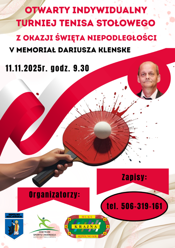 Gmina Sępólno Krajeńskie, MLKS Krajna Sępólno Krajeńskie oraz Centrum Sportu i Rekreacji w Sępólnie Krajeńskim zaprasza na kolejny Otwarty Indywidualny Turniej Tenisa Stołowego z Okazji Święta Niepodległości. Będzie to także V Memoriał Dariusza Klenske, zmarłego, wieloletniego trenera i zawodnika MLKS Krajna. Zmagania odbędą się 11 listopada 2025r. (wtorek) o godz. 9.30 w hali Krajna Arena. Zapisy przyjmowane będą telefonicznie pod numerem telefonu 506-319-161 do dnia 8 listopada 2025r. lub osobiście w dniu zawodów do godz. 9.00. Turniej przeprowadzony zostanie w 6 kategoriach: Czytaj dalej