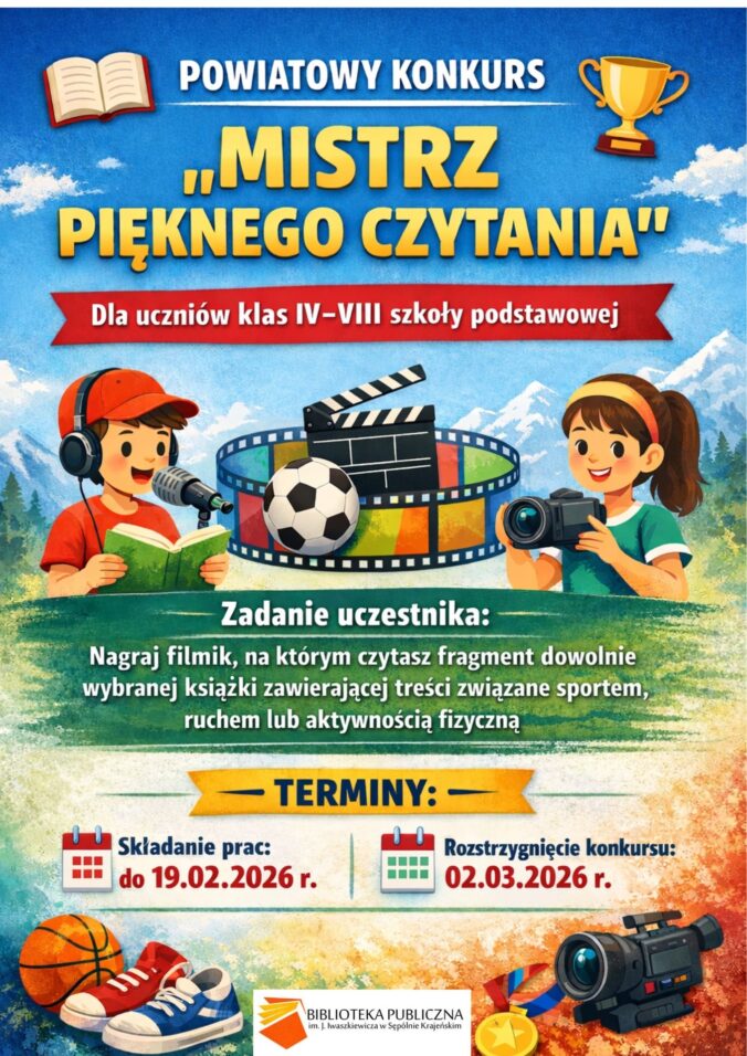 Biblioteka Publiczna im. J. Iwaszkiewicza zaprasza uczniów klas IV-VIII SP z powiatu sępoleńskiego do udziału w kolejnej edycji konkursu pt. „Mistrz Pięknego Czytania”. Czytaj dalej