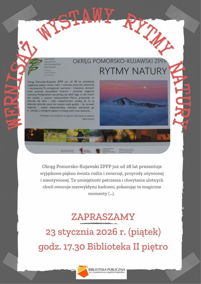 Zapraszamy w piątek 23 stycznia 2026r. o godz. 17.30 na wernisaż wystawy fotograficznej Okręgu Pomorsko-Kujawskiego Związku Polskich Fotografików Przyrody, którzy już od 28 lat prezentują