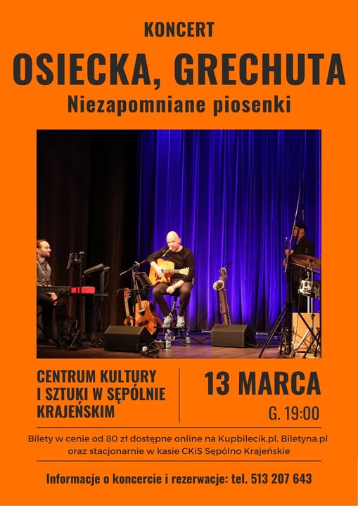 Mieszkańcy Sępólna Krajeńskiego i okolic będą mieli niepowtarzalną okazję, by przeżyć wieczór pełen wzruszeń i ponadczasowej muzyki. 13 marca 2026 roku o godzinie 19:00 w Centrum Kultury i Sztuki odbędzie się koncert „Osiecka, Grechuta – niezapomniane piosenki | Tomasz Steńczyk z zespołem”. Czytaj dalej