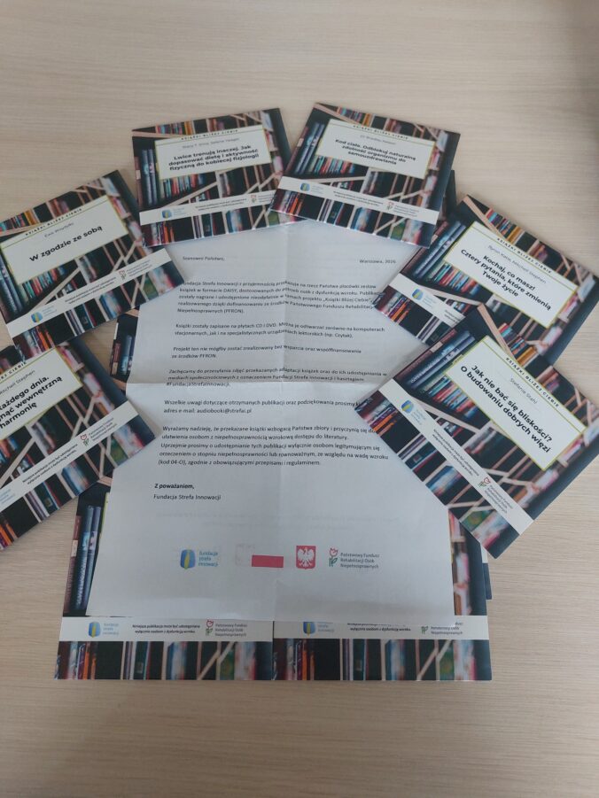 Miło nam poinformować, że Fundacja Strefa Innowacji przekazała naszej bibliotece zestaw książek w formacie DAISY, dostosowanych do potrzeb osób z dysfunkcją wzroku. Publikacje te zostały nagrane i udostępnione nieodpłatnie w ramach projektu „Książka bliżej Ciebie”, realizowanego dzięki dofinansowaniu ze środków Państwowego Funduszu rehabilitacji Osób Niepełnosprawnych (PFRON)
