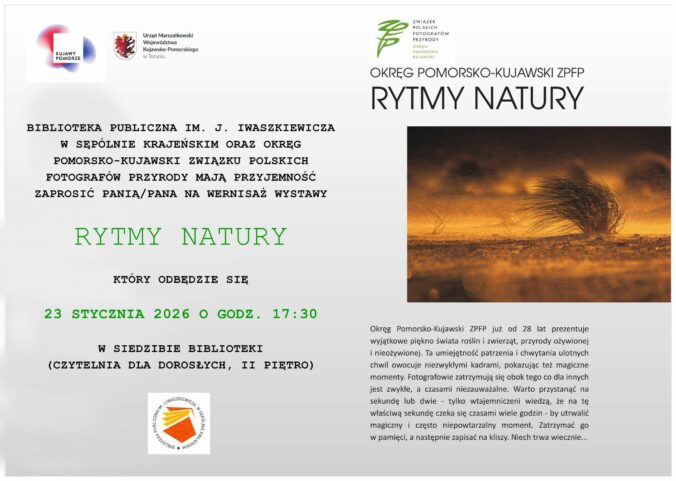 Zapraszamy w piątek 23 stycznia 2026r. o godz. 17.30 na wernisaż wystawy fotograficznej Okręgu Pomorsko-Kujawskiego Związku Polskich Fotografików Przyrody, którzy już od 28 lat prezentują
