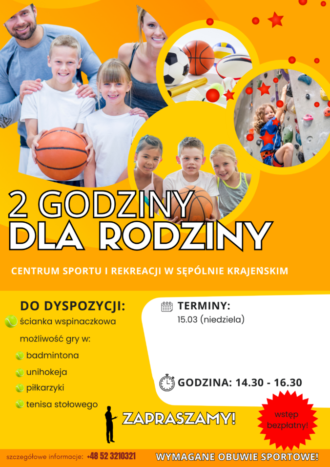 Zapraszamy na „Dwie Godziny dla Rodziny”. Jest to czas, w którym każdy chętny może przyjść do hali Krajna Arena i bezpłatnie skorzystać z przygotowanych atrakcji. Można zagrać w siatkówkę, badmintona, piłkę nożną, unihokeja, tenisa stołowego i wiele innych. Do dyspozycji jest również ścianka wspinaczkowa z samoasekuracją. Dodatkowo w ramach Dwóch Godzin dla Rodziny w każdy wtorek i czwartek w godzinach 19.00 – 21.00 dostępna jest sala „Pilawa” do gry w tenisa stołowego.