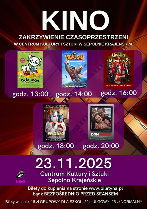 Zapraszamy Was do kina 23 listopada 2025 r. wraz z Zakrzywieniem Czasoprzestrzeni, w Centrum Kultury i Sztuki w Sępólnie Krajeńskim wyświetlimy dla Was filmy: „Kicia Kocia ma braciszka”, „Super pies i kot łotr”, „Uwierz w Mikołaja 2”, „Ministranci” oraz „Dom dobry”.