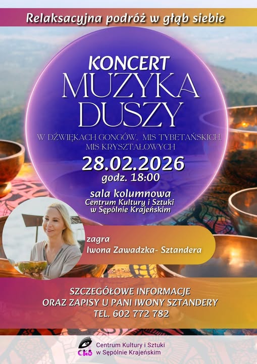 Serdecznie zapraszamy 28 lutego o godz. 18:00 do Centrum Kultury i Sztuki w Sępólnie Krajeńskim wszystkich, którzy pragną doświadczyć magii dźwięku, przywrócenia wewnętrznej równowagi oraz odnalezienia głębokiego, wewnętrznego spokoju.