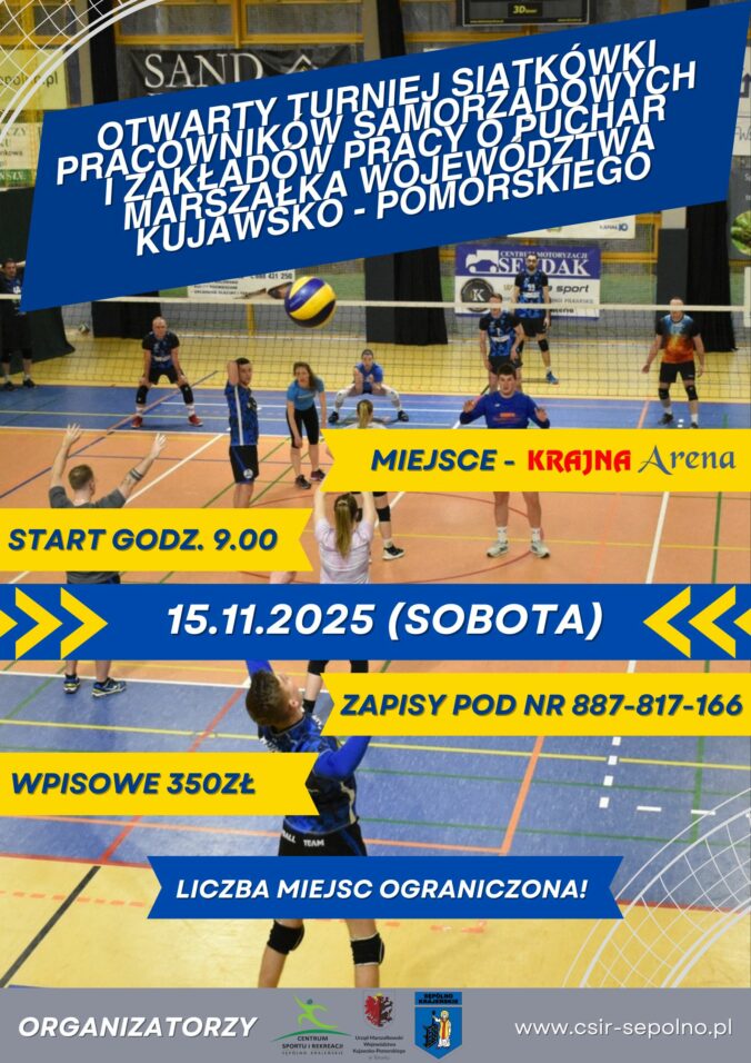 Zapraszamy do udziału w Otwartym Turnieju Siatkówki Pracowników Samorządowych i Zakładów Pracy o Puchar Marszałka Województwa Kujawsko – Pomorskiego. Turniej organizowany jest w ramach obchodów Święta Niepodległości. Organizatorami wydarzenia są: Urząd Marszałkowski Województwa Kujawsko – Pomorskiego w Toruniu, Gmina Sępólno Krajeńskie oraz Centrum Sportu i Rekreacji w Sępólnie Krajeńskim. Zmagania odbędą się 15 listopada (sobota) o godz. 9.00. W rozgrywkach mogą brać udział drużyny amatorskie, składające się z pracowników samorządowych, innych zakładów pracy oraz sympatyków siatkówki. Wpisowe wynosi 350zł od drużyny. Wszystkie zespoły otrzymają pamiątkowe puchary oraz dyplomy, a najlepsza trójka medale. Dodatkowo wyróżniony zostanie najlepszy zawodnik i zawodniczka turnieju.