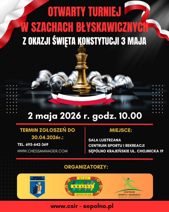Gmina Sępólno Krajeńskie, MLKS Krajna Sępólno Krajeńskie oraz Centrum Sportu i Rekreacji w Sępólnie Krajeńskim zapraszają na Otwarty Turniej w Szachach Błyskawicznych z Okazji Święta Konstytucji 3 maja, który odbędzie się 2 maja 2026r. o godzinie 10.00 w Sali Lustrzanej Centrum Sportu i Rekreacji (wejście od strony kortów tenisowych – wjazd od stacji BP) ul. Chojnicka 19.