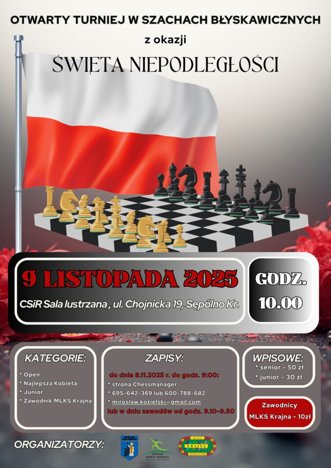 Gmina Sępólno Krajeńskie, Centrum Sportu i Rekreacji w Sępólnie Krajeńskim oraz MLKS Krajna Sępólno Krajeńskie zapraszają na Otwarty Turniej w Szachach Błyskawicznych z Okazji Święta Niepodległości. Turniej zgłoszony jest do oceny rankingowej FIDE. Zmagania odbędą się w Sali Lustrzanej – Centrum Sportu i Rekreacji ul. Chojnicka 19. w niedzielę 9 listopada o godz. 10.00.