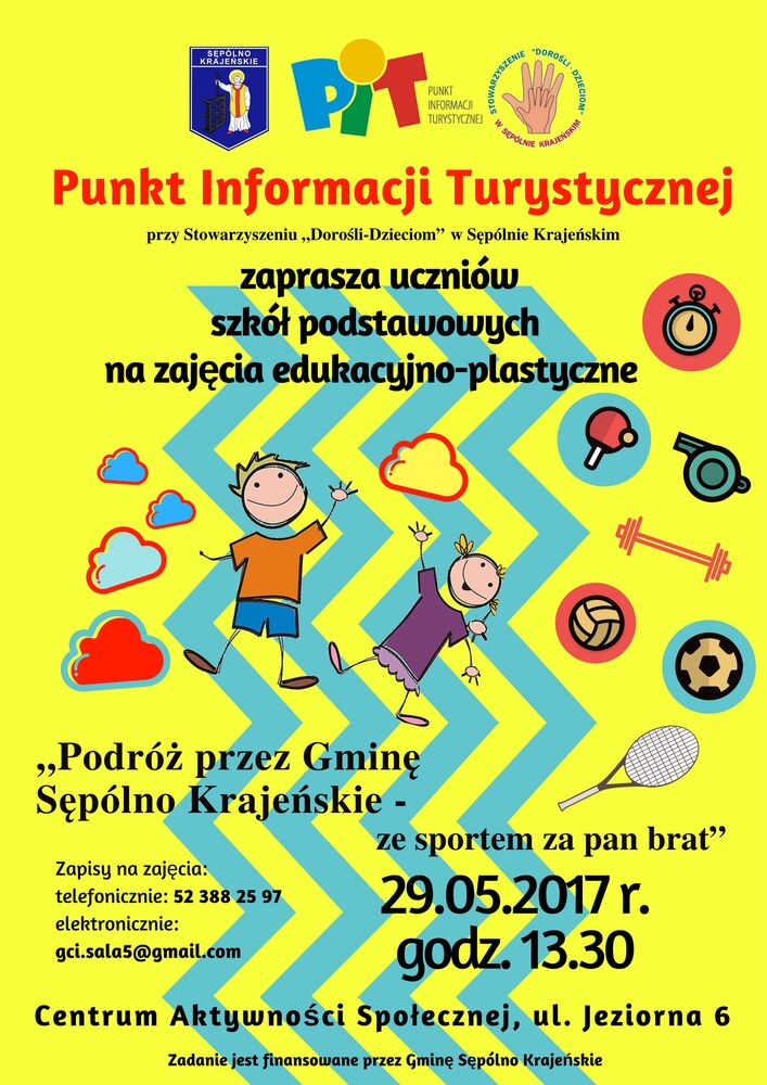 Punkt Informacji Turystycznej przy Stowarzyszeniu „Dorośli-Dzieciom” w Sępólnie Krajeńskim serdecznie zaprasza dzieci klas I – VI szkół podstawowych 29 maja 2017 r. o godz. 13.30 na zajęcia pn. „Podróż przez Gminę Sępólno Krajeńskie – ze sportem za pan brat”.