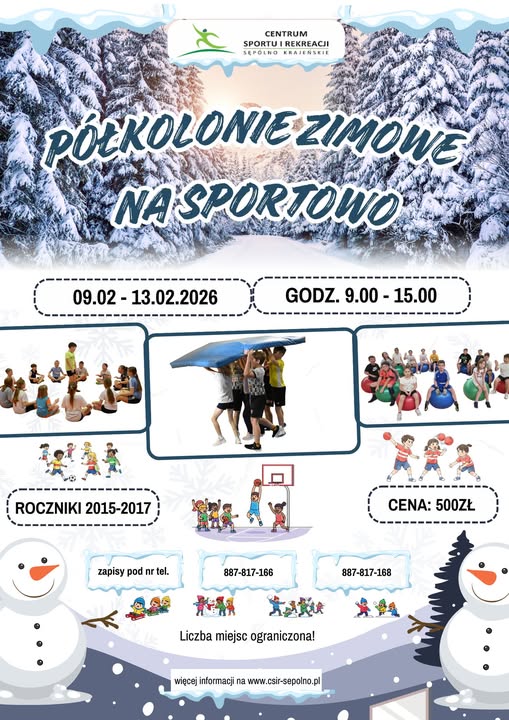 Zapraszamy do udziału w Półkoloniach Zimowych na Sportowo, które odbędą się w drugim tygodniu ferii, tj. od 9.02 do 13.02 w godzinach od 9.00 do 15.00. Zajęcia ukierunkowane będą na rozwój sportowy dziecka. Obejmować będą naukę gry w piłkę nożną, tenisa ziemnego, tenisa stołowego oraz inne zajęcia sportowo – rekreacyjne. Organizator zapewnia również dwa posiłki dziennie (drugie śniadanie i obiad).